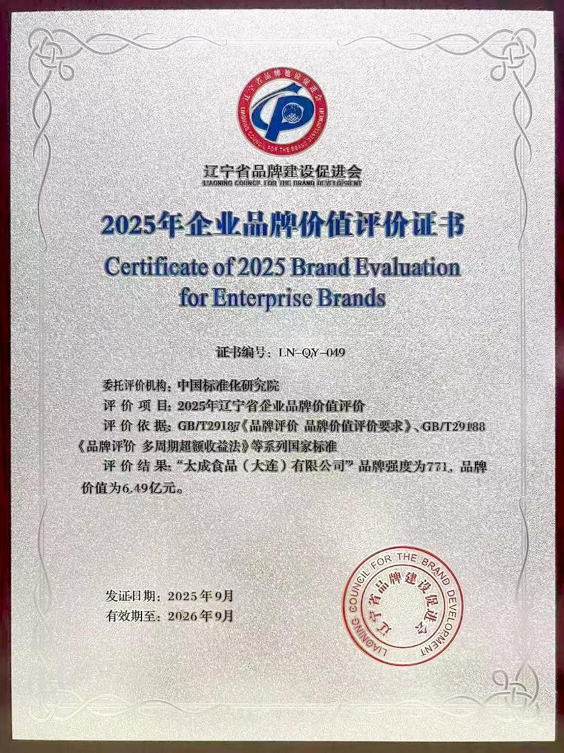 In the "2025 Liaoning Province Enterprise Brand Value Evaluation",Great Wall Food (Dalian) Co., Limited was awarded the authoritative brand value evaluation certificate - brand strength 771 (at the "very Strong" level, with strength levels divided into extremely strong, very strong, relatively strong, medium and relatively weak), thanks to its profound industrial chain accumulation and outstanding market performance. The brand value is assessed at RMB 649 million.