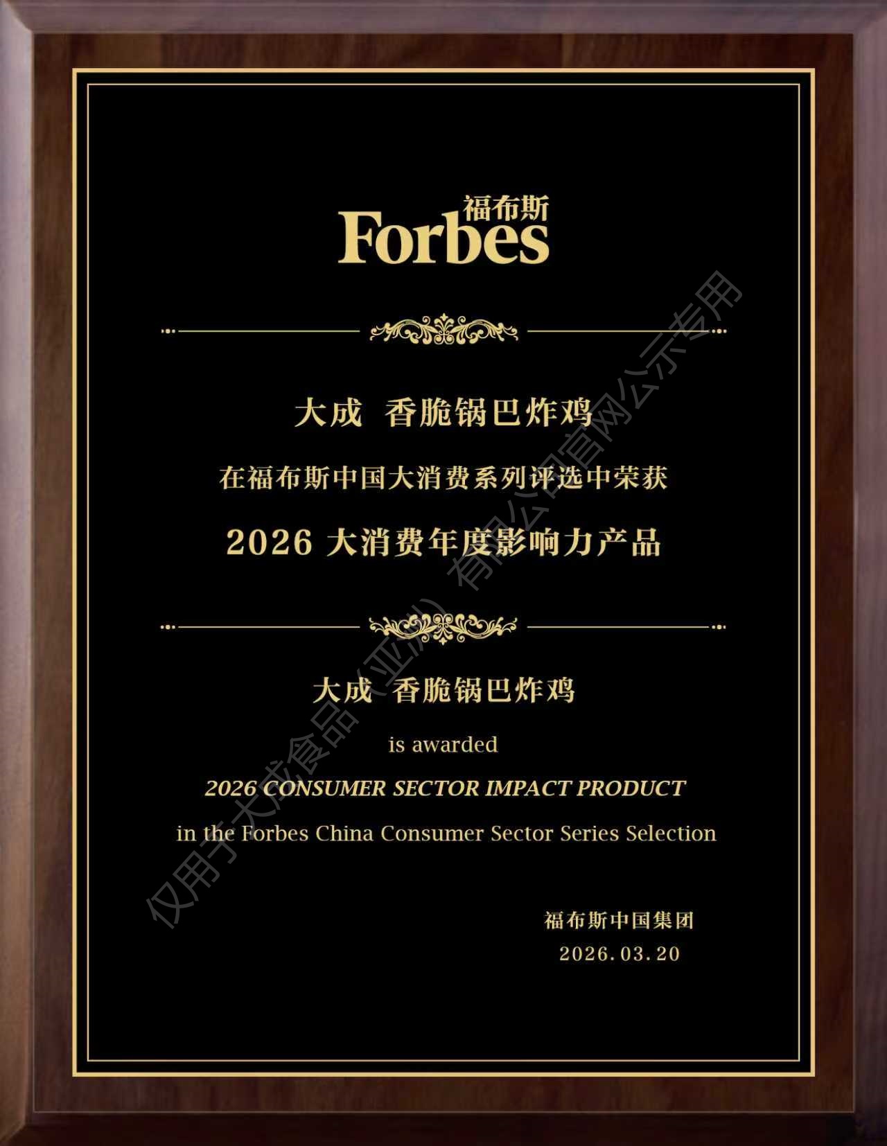 福布斯机构颁发大成盐酥鸡“2024大消费年度影响力产品”